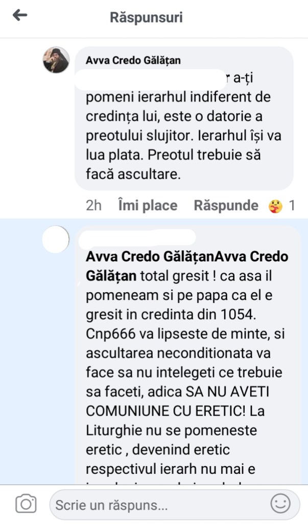 Avva Credo Gălățan total gresit ! ca asa il pomeneam si pe papa ca el e gresit in credinta din 1054. Cnp666 va lipseste de minte, si ascultarea neconditionata va face sa nu intelegeti ce trebuie sa faceti, adica SA NU AVETI COMUNIUNE CU ERETIC! La Liturghie nu se pomeneste eretic , devenind eretic respectivul ierarh nu mai e ierarh ci pseudo-ierarh de aceea putem sa IL JUDECAM si SA IL OSANDIM, ca nu osandim si judecam ierarh orthodox ci ERETIC. Asta e minciună ca e DATORIE=OBLIGATIE a pomeni eretic la Liturghie. Si preotul care MINTE LA LITURGHIE isi va lua plata CA MINTE LA LITURGHIE ca acela(pseudo-ierarhul) e orthodox! si ptr. PARTASIA CONSTIENTA ce o are cu ereticul episcop, care partasie constienta e anathematizata de ANATHEMA ROCOR 1983. Dovada ca nu deosebiti intre lup si ierarh, intre orthodox si eretic e ca instati pe mincinoasa pomenire a ereticului uitand cuvintele scripturii CE PARTASIE ARE LUMINA CU INTUNERICUL si celelate scrise in continuare, ori prin mincinoasa pomenire se creaza partasie in MINCIUNA! ce orthodox e acela ce minte la Liturghie că un minciuno-episcop ce a semnat erezii e orthodox???Oare minciuna nu e de la tatal minciunii??Daca era DATORIE pomenirea ereticului si comuniunea=partasia cu eretic nu mai existau can. 15 I-II si can. 2 Teofil care explica , CĂ DATORIA=OBLIGATIA ADEVARATA e a nu il pomeni pe eretic si a nu avea comuniune cu el, cine nu respecta canoanele nu e orthodox !